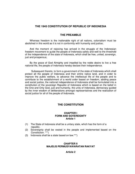 The 1945 Constitution holds immense significance in Indonesian history and continues to shape the nation’s legal, political, and social landscape. As the supreme law of the land, it provides the framework for the organization of the state, the distribution of power, and the protection of individual rights. Its legacy extends beyond the legal realm, influencing the nation’s identity, values, and aspirations. The constitution serves as a symbol of national unity and a foundation for democratic governance. Its principles and provisions are invoked in legal proceedings, political debates, and public discourse, reflecting its enduring relevance in Indonesian society.