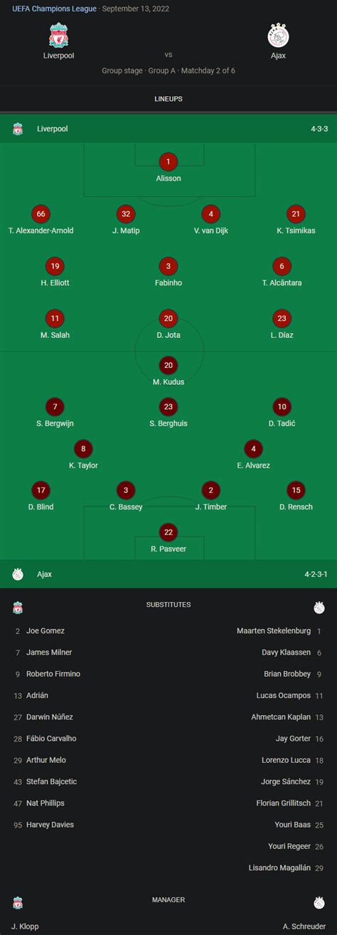 Before the whistle even blew, the Ajax vs Liverpool 2022 encounter was already a massive talking point. Both teams were in pretty good form leading up to this fixture, each boasting impressive domestic and European records. Ajax, under their manager Erik ten Hag at the time, were playing some scintillating football. They had a knack for scoring goals and often dominated possession, showcasing a brand of attractive, attacking play that thrilled fans worldwide. Their squad was a blend of experienced campaigners and emerging stars, like Antony and Jurrien Timber, who were making waves in European football. On the other side, Liverpool, managed by the charismatic Jurgen Klopp, were a well-oiled machine. They were known for their relentless pressing, quick transitions, and devastating attacking trio. Players like Mohamed Salah, Sadio Mané (at the time), and Diogo Jota were in lethal form, capable of turning a game on its head in an instant. The tactical battle was expected to be fascinating. Would Ajax try to control possession and pick Liverpool apart with intricate passing? Or would Liverpool’s high-energy pressing stifle Ajax’s creativity and force turnovers? Coaches often have their favored formations, and for this clash, Ajax typically lined up in a 4-3-3, emphasizing width and attacking midfielders. Liverpool, also often employing a 4-3-3, were masters at adapting their pressing triggers and midfield configurations to exploit opponent weaknesses. The starting lineups themselves were scrutinized intensely. Any surprise inclusions or omissions could hint at the managers’ intentions. The weight of expectation was immense. For Ajax, this was a chance to prove they could compete with the elite of Europe on the biggest stage. For Liverpool, it was about solidifying their status as one of the continent’s top clubs and advancing in their quest for European glory. The air was thick with anticipation, and the football world was watching, eager to see which of these titans would emerge victorious.