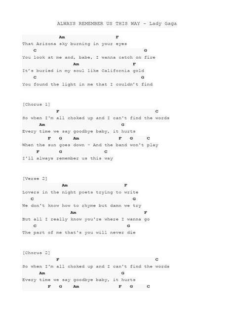 Learning to play “ Always Remember Me This Way ” on guitar is a rewarding experience that allows you to connect with the song on a deeper level. By mastering the essential chords, practicing the strumming pattern, and incorporating helpful tips, you can create a beautiful rendition of this timeless ballad. Don’t be afraid to experiment with advanced techniques and add your personal touch to make the song your own. Keep practicing, stay patient, and most importantly, have fun! Happy playing, and remember to always keep the music alive!
