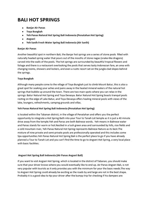 So there you have it, guys! Bali offers a diverse and incredible array of hot springs, each with its own unique charm and therapeutic benefits. From the popular and accessible Banjar Hot Springs to the secluded jungle oasis of Angseri, the stunning lakeside views at Toya Devasya, and the tranquil escape of Sidemen, there’s a perfect spot waiting for you. These natural wonders provide a fantastic opportunity to relax, rejuvenate, and connect with the island’s powerful natural energy. Whether you’re seeking relief from sore muscles, a moment of quiet contemplation, or simply a unique travel experience, the hot springs of Bali deliver. Remember to pack smart, be respectful of the culture and environment, and embrace the journey. Your ultimate relaxation adventure is just a soak away! Don’t miss out on this essential Bali experience – your body and mind will thank you. Happy travels and happy soaking!