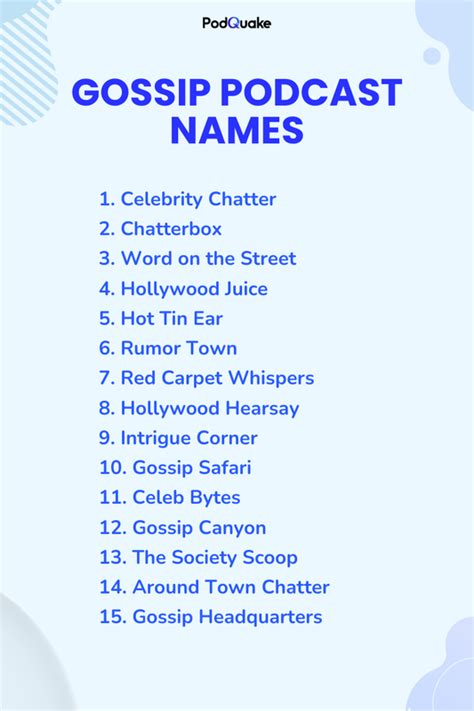 Alright, let’s get down to business, people! When we’re thinking up podcast name ideas for gossip , the goal is to capture attention instantly. You need a name that’s not just a label, but a promise of entertainment, insider knowledge, and maybe a little bit of harmless fun. Let’s break down some categories and spark some inspiration. First up, we have the direct and punchy names . These are the ones that leave no room for doubt. Think titles like “The Daily Dish,” “Gossip Central,” or “Spill the Tea.” They’re straightforward, easy to remember, and immediately tell potential listeners exactly what they’re getting. These names often work well because they leverage common phrases associated with gossip, making them instantly relatable. They create a sense of community around the shared love for uncovering and discussing the latest happenings. Imagine scrolling through a podcast app – a name like “The Daily Dish” just pops out, promising fresh content every day. It’s a commitment, sure, but it sets clear expectations. Then there are the playful and witty names . These names use wordplay, puns, or a touch of humor to stand out. Consider options like “Dish It Out,” “He Said, She Said, We Said,” or “The Rumor Mill.” These names add personality and can make your podcast feel more approachable and fun. They suggest that while you’re discussing gossip, you’re also having a good time doing it, which is infectious for listeners. A witty name can also help differentiate you from more serious or straightforward gossip outlets. It implies a certain level of lightheartedness and insider banter that listeners will enjoy being a part of. “The Rumor Mill” specifically conjures an image of a place where secrets are churned and spread, perfectly fitting the gossip theme. Moving on, we have intriguing and mysterious names . These names pique curiosity without giving everything away. Think titles like “Whispers & Wonders,” “Behind the Velvet Rope,” or “The Inner Circle.” These names suggest exclusivity and hidden knowledge, making listeners eager to tune in and find out what secrets you’re revealing. They create an aura of sophistication and exclusivity, appealing to those who feel like they’re part of an in-crowd when they listen. “Behind the Velvet Rope” immediately brings to mind exclusive parties and celebrity events, hinting at behind-the-scenes gossip. “Whispers & Wonders” is a bit more poetic, suggesting secrets that are both intriguing and perhaps even surprising. Finally, let’s not forget niche-specific names . If your gossip focuses on a particular area – like celebrity gossip, reality TV, or industry secrets – tailor your name accordingly. Examples include “Celeb Chatter,” “Reality Recap,” or “Hollywood Hot Takes.” This helps you attract a dedicated audience interested in that specific type of content. “Celeb Chatter” is self-explanatory and targets a huge audience interested in celebrity news. “Reality Recap” is perfect for shows dissecting the latest drama from your favorite reality TV programs. These targeted names ensure that your ideal listener finds you easily and knows they’ve come to the right place for their specific gossip cravings. Remember, the best name is one that resonates with you and your intended audience. It should be easy to say, spell, and remember. Test out a few names with friends, see which ones get the best reaction, and trust your gut. The right name is out there, waiting to be discovered!