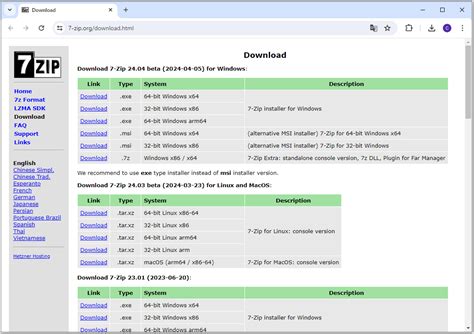 • On the homepage, look for the download section. You should see different versions of 7-Zip available for various operating systems.