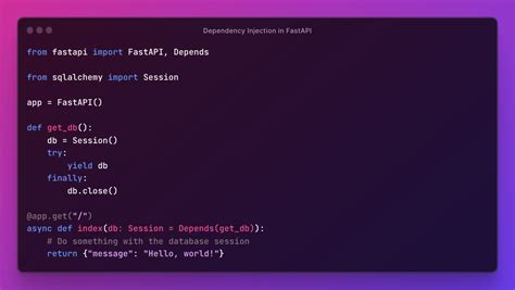 See what we did there? The get_db function is our dependency. It creates a new database session, yields it to the endpoint that needs it (our /items/ endpoint in this case), and then ensures the session is closed when the request is done. The db: Session = Depends(get_db) line in the endpoint function is the magic. FastAPI sees Depends(get_db) , knows it needs to call get_db , and injects the returned database session object ( db ) directly into your endpoint. It’s incredibly elegant, right? This pattern ensures that every request gets its own fresh database session, and importantly, that session is properly closed afterwards, preventing resource leaks. We’re abstracting away the lifecycle management of the database session. Your endpoint function doesn’t need to know how the session was created or how it will be closed; it just receives a usable Session object. This makes your endpoint code incredibly clean and focused. We can also add more complex setup logic within get_db if needed, such as setting specific transaction isolation levels or performing initial data loading, without cluttering our API routes. This is a fundamental step towards building scalable and maintainable applications. It’s the backbone of how many successful FastAPI applications manage their database interactions.