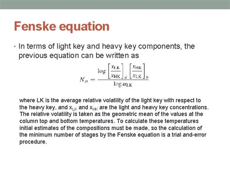 Hey guys, let’s dive deep into the Fenske equation , a real game-changer when it comes to designing distillation columns. If you’re working in chemical engineering or just tinkering with separation processes, you’ll want to get cozy with this formula. It’s not just some obscure academic concept; it’s a practical tool that helps us figure out the minimum number of theoretical stages needed for a separation. This is crucial because more stages mean a taller, more expensive column, so optimizing this is key to keeping costs down and efficiency up. We use it to estimate the minimum reflux ratio as well, which is another critical parameter affecting both separation performance and operational expenses. Understanding the Fenske equation means you can make informed decisions about column design, predict performance, and troubleshoot issues that pop up during operation. It’s all about efficiency and cost-effectiveness in chemical processing, and this equation gives us a solid starting point. So, whether you’re a seasoned pro or just starting out, mastering the Fenske equation will definitely give you an edge in the world of chemical engineering and separations.