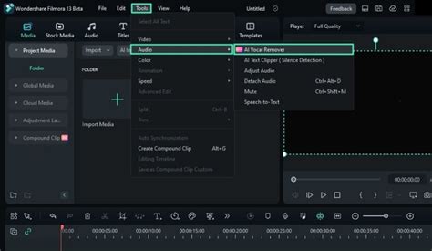 2. Access the AI Vocal Remover : Click on your audio file in the timeline. In the right-hand panel, you should see options related to audio. If you don’t see the Vocal Remover, ensure your Filmora is updated to the latest version. This feature is often available under the ‘Audio’ or ‘AI Tools’ section.