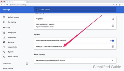 3. Find Network Settings: In the Settings tab, scroll down to the bottom and click on “Advanced.” This opens up more detailed options. Then, look for the “System” section. You should see an option that says “Open your computer’s proxy settings.”
