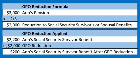 Let’s get down to the nitty-gritty: how is the Government Pension Offset (GPO) actually calculated? It’s a bit of a formula, and understanding it can help you predict your benefit amount. The Social Security Administration reduces your spousal or survivor benefit by two-thirds of the amount of your government pension. Two-thirds , guys! That’s a substantial chunk. So, the formula looks something like this: Pension Amount / 3 * 2 = Offset Amount. This offset amount is then subtracted directly from the Social Security benefit you would otherwise be eligible to receive. Here’s a simple example to illustrate: Let’s say you are eligible for a Social Security spousal benefit of \(1,000 per month based on your spouse's record. However, you also receive a pension from a state government job where you didn't pay Social Security taxes, and that pension is \) 900 per month. The Social Security Administration will calculate the offset: ( \(900 pension / 3) * 2 = \) 600. This \(600 is the GPO. Then, they subtract this offset from your potential Social Security benefit: \) 1,000 (potential benefit) - \(600 (offset) = \) 400. So, your actual monthly Social Security benefit would be \(400. It's important to note that your Social Security benefit can never be reduced to zero by the GPO. You will always receive *at least* the amount of your own Social Security benefit based on your own work record (if you have one and it's higher than the reduced spousal/survivor benefit). However, if your own earnings record yields a benefit of, say, \) 300, and the GPO calculation reduces your spousal benefit to \(400, you'd still get \) 400. If your own record yielded \(500, and the GPO reduced your spousal benefit to \) 400, you’d get the $500 instead. The GPO only applies to spousal and survivor benefits, not your own retirement benefit based on your own work history. This calculation is performed annually, and adjustments can be made if your pension amount changes. It’s crucial to provide accurate pension information to the Social Security Administration to ensure the calculation is correct. Mistakes can happen, so keeping records is key.