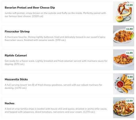Some menus often showcase their signature dishes, which are usually the stars of the show! These are the dishes that Hurricane is known for, the ones that keep people coming back for more. These signature items might include anything from gourmet burgers and flavorful sandwiches to fresh salads and pasta dishes. Keep an eye out for these special dishes, as they’re often the highlights of the menu. And, of course, no meal is complete without a selection of sides and appetizers! You’ll likely find a tempting array of options, like crispy fries, onion rings, tasty salads, and other small plates designed to share or enjoy before your main course arrives. These are great for whetting your appetite and adding some extra flavor to your dining experience. Drinks are also a big part of the Hurricane Menu experience. You’ll likely find a wide selection of beverages, from soft drinks and iced tea to specialty cocktails and craft beers. Many locations are known for their signature drinks, so be sure to explore those options too!