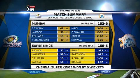 Mumbai Indians won the toss and elected to bat first. Quinton de Kock and Rohit Sharma provided a solid start, but the CSK bowlers, led by Jasprit Bumrah and Lasith Malinga, kept taking wickets at regular intervals. MI eventually managed to reach a modest total of 149 8 . CSK’s bowlers bowled with discipline and kept the scoring in check. MI’s innings was a struggle, with CSK’s bowlers dominating the proceedings.