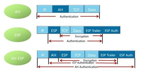 • Encapsulating Security Payload (ESP) : ESP provides confidentiality, data integrity, and authentication. It encrypts the payload and adds an ESP header and trailer to the packet. The ESP header includes the SPI, and the trailer contains the ICV. This is the most commonly used protocol in transport mode.