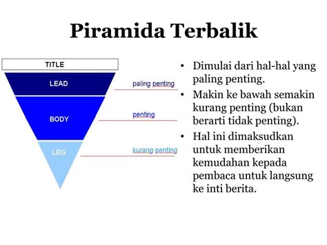 Oke, bayangin aja piramida. Yang paling gede di bawah, yang paling kecil di atas, kan? Nah, kalau piramida terbalik, kebalikannya. Yang paling penting, paling krusial, paling ‘wow’ itu kita taruh di paling atas . Semakin ke bawah, informasinya makin detail, makin nggak begitu vital, atau bahkan bisa jadi pelengkap aja. Jadi, intinya, kita kasih tahu hal terpenting dulu di awal, baru nanti kita tambahin detail-detailnya. Kenapa kok dibikin kayak gini? Gampang banget, guys. Di zaman serba cepat kayak sekarang, orang itu nggak punya banyak waktu. Mereka pengen tahu inti masalahnya secepat mungkin. Dengan metode piramida terbalik, pembaca itu langsung dapat ‘poin’-nya di paragraf pertama atau kedua. Kalau mereka tertarik, mereka bakal lanjut baca sampai bawah. Kalau nggak, ya udah, mereka udah dapat info utamanya. Praktis, kan?