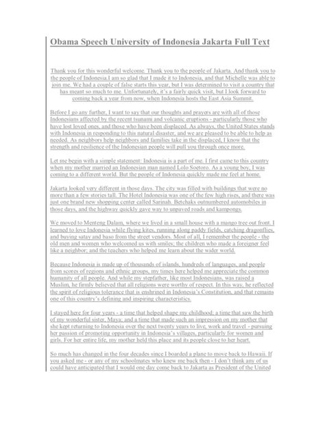 Hey everyone! Today, we’re diving deep into a truly significant moment in recent history: Barack Obama’s speech at Indonesia University . This wasn’t just any old address; it was a powerful articulation of connection, shared values, and a vision for the future that resonated across continents. For those of you who might not remember the exact context, Obama’s visit to Indonesia in 2010 was a big deal. He spent part of his childhood there, and this speech, delivered at one of Indonesia’s most prestigious academic institutions, was a chance for him to connect with the Indonesian people on a personal and profound level. It was a moment filled with historical weight, reflecting his unique background and the complex relationship between the United States and Indonesia. The anticipation leading up to this speech was palpable. Everyone wanted to hear what the first American president with Indonesian roots would say to the nation that shaped part of his early life. The university setting itself added a layer of intellectual gravitas, suggesting a focus on education, progress, and the power of ideas. Think about it, guys, a leader of a global superpower addressing the next generation of thinkers and leaders in a country that holds a special place in his personal narrative. This wasn’t just about diplomatic niceties; it was about building bridges, fostering understanding, and acknowledging the deep historical and cultural ties that bind nations. The setting at the university also implied a dialogue, a space for critical thought and engagement, rather than a one-way pronouncement. It was an opportunity to discuss the challenges and opportunities facing both nations and the world, framed within the context of education and empowerment. The echoes of this speech continue to be felt, reminding us of the power of personal connection in international relations and the importance of understanding diverse perspectives. It was a masterclass in public speaking, blending personal anecdote with global policy, all delivered with a warmth and sincerity that captivated the audience. The choice of a university was deliberate, signaling a commitment to the youth and the future, and a belief in the transformative power of education as a tool for diplomacy and mutual respect. The speech itself delved into a variety of themes, but the underlying message was one of shared humanity and common aspirations. It was a call to action, urging young Indonesians to embrace their potential and to contribute to a more peaceful and prosperous world. The setting was grand, the speaker was historic, and the message was timely and timeless. The university campus buzzed with an energy that was both academic and electric, reflecting the significance of the occasion. It was a moment where history, personal narrative, and global policy converged, creating a speech that was both deeply personal and universally relevant. The choice of venue was not accidental; it was a strategic decision to engage with the intellectual heart of Indonesia, to inspire its future leaders, and to reinforce the bonds of friendship and cooperation. The Indonesian university served as a powerful symbol of learning, growth, and the boundless potential of the human spirit, making it the perfect backdrop for Obama’s message of hope and progress. It was a speech that aimed to inspire, to educate, and to forge stronger connections between two nations, all within the hallowed grounds of academic pursuit and intellectual exchange. The atmosphere was charged with a sense of occasion, as students, faculty, and dignitaries gathered to witness a historic address. The university’s architecture, the vibrant spirit of its students, and the symbolic importance of the location all contributed to the unique aura of the event. This speech wasn’t just a formality; it was a carefully crafted address designed to leave a lasting impression and to solidify relationships. The echoes of Obama’s words, spoken with such conviction and personal resonance, reverberated far beyond the university walls, shaping perceptions and fostering a renewed sense of optimism for the future of bilateral relations. The academic setting provided a natural platform for discussing complex issues, encouraging critical thinking, and promoting a spirit of inquiry. It was a testament to the power of education and its role in shaping informed citizens and responsible global leaders. The speech was a beautiful blend of personal reflection and forward-looking policy, all delivered with Obama’s signature eloquence. The energy on campus was electric, a mix of anticipation and excitement for what the President would share. It was a moment where the personal met the political, and where a global leader spoke directly to the hearts and minds of the future generation. The university setting was a brilliant choice, underscoring the importance of knowledge, dialogue, and the pursuit of a better world. The speech itself was a powerful reminder of the interconnectedness of our world and the need for mutual understanding and respect. It was a call to embrace diversity, to celebrate our common humanity, and to work together to overcome shared challenges. The backdrop of an Indonesian university amplified these themes, connecting them to the aspirations of young people and the pursuit of academic excellence. It was a speech that aimed to inspire, to empower, and to strengthen the bonds of friendship between nations.