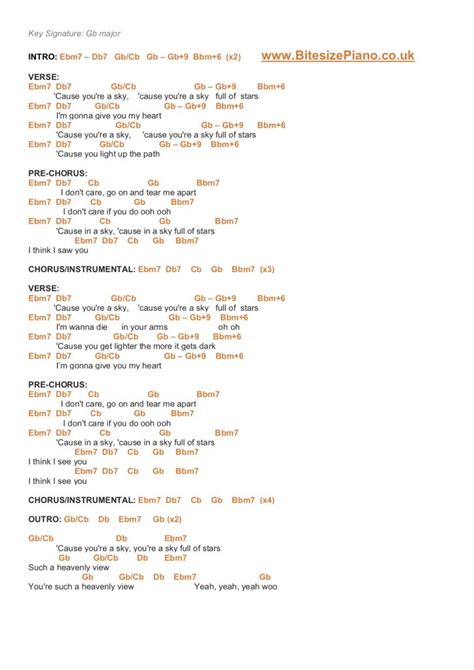 The intro of “Sky Full of Stars” is instantly recognizable, and it sets the tone for the rest of the song. It begins with a simple yet catchy piano riff that repeats throughout the intro. This riff is based on the main chords we discussed earlier: C major, G major, A minor, and F major. The key to mastering the intro is to focus on the rhythm and timing of the notes. Practice the riff slowly at first, paying close attention to the note durations and the spaces between the notes. Once you’re comfortable with the rhythm, gradually increase the speed until you can play it at the original tempo.