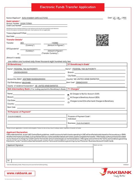 Alright, let’s get down to the nitty-gritty and walk through how to fill out the RAKBANK EFT form . Don’t worry, it’s not as complicated as it might seem! Just follow these steps, and you’ll be transferring funds like a pro. First things first, get your hands on the form. You can usually find it on RAKBANK’s website, or you can pick one up at your local branch. Make sure you have the most up-to-date version, as forms can change over time. Once you have the form, start with the basics: your information. This typically includes your name, account number, and contact details. Make sure you fill this section out accurately, as it’s how RAKBANK will identify you as the sender of the funds. Next, you’ll need to provide the recipient’s information. This is probably the most crucial part, so double-check everything! You’ll need the recipient’s name, the name of their bank, their bank’s branch details, and their account number. Any errors here can result in the transfer failing or the money going to the wrong place. Moving on, you’ll need to specify the amount you want to transfer. Write the amount clearly, and make sure it matches what you intend to send. Also, you’ll need to indicate the currency you’re using. Another important section is the purpose of the transfer. This is where you’ll briefly explain why you’re sending the money. This could be for paying a bill, transferring funds to a family member, or any other valid reason. Finally, you’ll need to sign and date the form. Your signature confirms that you authorize the transfer. Once you’ve completed all these steps, double-check all the information to make sure everything is accurate. Submit the completed form to RAKBANK, either in person at a branch or through the online banking portal, depending on the options available. Following these steps ensures a smooth EFT experience.