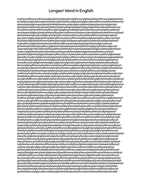 Alright, guys, drumroll, please! The longest word in the English language is a doozy, and it’s not a single word you’ll find in everyday conversation. It’s a scientific term, specifically the chemical name for the protein known as titin. Are you ready for it? Here it is: methionylthreonylthreonylglutaminylarginyl…isoleucine . And it continues, and continues, and continues, for a staggering 189,819 letters! Yes, you read that right. Imagine trying to pronounce that without taking a breath, haha. That mouthful of a word is so long that it would take you over three hours to say it out loud without stopping. It’s a true testament to the complexities of scientific nomenclature and the detailed descriptions needed in the field of chemistry and biology. This word isn’t just long; it’s a detailed, almost poetic, description of the amino acid sequence of the titin protein. The sheer scale of the word reflects the massive size and intricate structure of the protein itself, essential for muscle elasticity in our bodies. It’s like the ultimate linguistic puzzle, where each piece represents a specific component of this amazing protein. It is no surprise that this word often leaves people in awe and somewhat intimidated. It is a symbol of the depths of scientific knowledge and the power of language to capture intricate data. Keep in mind though, while this is considered by many as the longest word, there are some debates, especially around whether it should be counted as a single word or a series of compound words. However, its widespread recognition and the scientific community’s acceptance solidify its place in the record books. So, the next time you hear someone say a word is long, just remember this champion and smile!