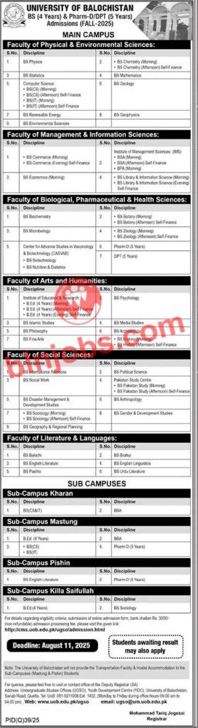 Now, let's get to the good stuff: what can you actually study at UOB? The University of Balochistan admission 2025 opens doors to a *massive* array of academic programs, catering to diverse interests and career aspirations. Whether you're fresh out of high school or looking to advance your postgraduate studies, UOB has got you covered. For undergraduate aspirants, they offer a robust selection of Bachelor's degrees across various faculties. Think about the Faculty of Arts, boasting programs like English, History, Political Science, Sociology, and Pashto – perfect for those passionate about humanities and social sciences. The Faculty of Science is equally impressive, offering degrees in Physics, Chemistry, Mathematics, Biology, Computer Science, and Statistics. If business and commerce are more your jam, the Faculty of Commerce provides degrees in Accounting, Finance, and Management. And let's not forget the Faculty of Law, offering the esteemed LLB degree. For those looking to specialize further, UOB has a strong postgraduate offering. Master's programs are available in most of the departments mentioned above, allowing for deeper exploration and research. Furthermore, the university is a hub for research, offering M.Phil. and Ph.D. programs for aspiring academics and researchers. They also often have specialized diplomas and certificate courses that can give you an edge in specific fields. When considering the University of Balochistan admission 2025 , it’s vital to research the specific departments and their unique offerings. Look into the faculty, the research opportunities, and the specific course structures. Does the program align with your career goals? Are there opportunities for internships or practical experience? UOB is committed to providing quality education, and exploring their extensive program list is the first step in finding your perfect academic fit. Don't just pick a program; choose a path that excites you and sets you up for future success. Dive deep into the UOB academic prospectus – it’s your roadmap to finding the program that’s just right for you!